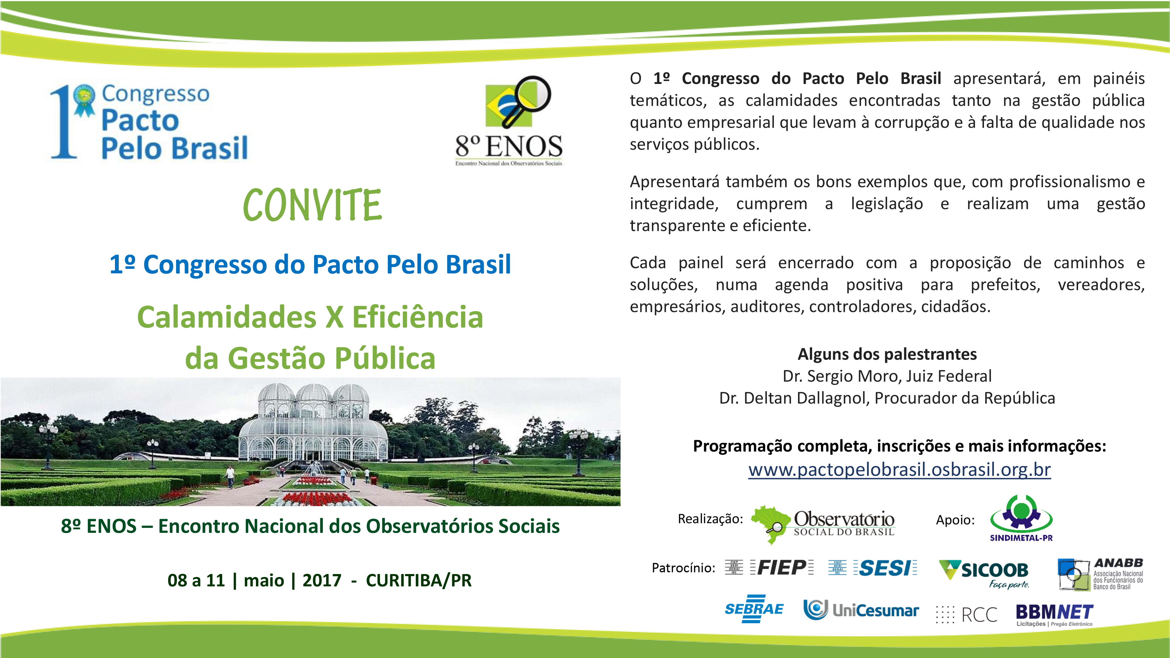 O Observatório Social do Brasil (OSB) promove, entre os dias 8 e 11 de maio de 2017, o 1º Congresso do Pacto Pelo Brasil, com o tema Calamidades X Eficiência da Gestão Pública. O evento, que será realizado na FIEP – Campus Indústria, em Curitiba (PR), tem o objetivo de mostrar que as calamidades na gestão pública podem ser superadas com o uso de instrumentos de controle, gestão profissional, transparência e participação do cidadão. O Congresso pretende, ainda, propor uma agenda positiva para os públicos envolvidos, bem como promover a cooperação técnica entre os Observatórios Sociais e consolidar alianças estratégicas nacionais para a eficiência da gestão pública como forma de garantir a transparência e prevenir a corrupção. As inscrições são gratuitas e poderão ser feitas no site do evento ( http://www.pactopelobrasil.osbrasil.org.br/pagina.php?id=1&nome=O%20Evento)