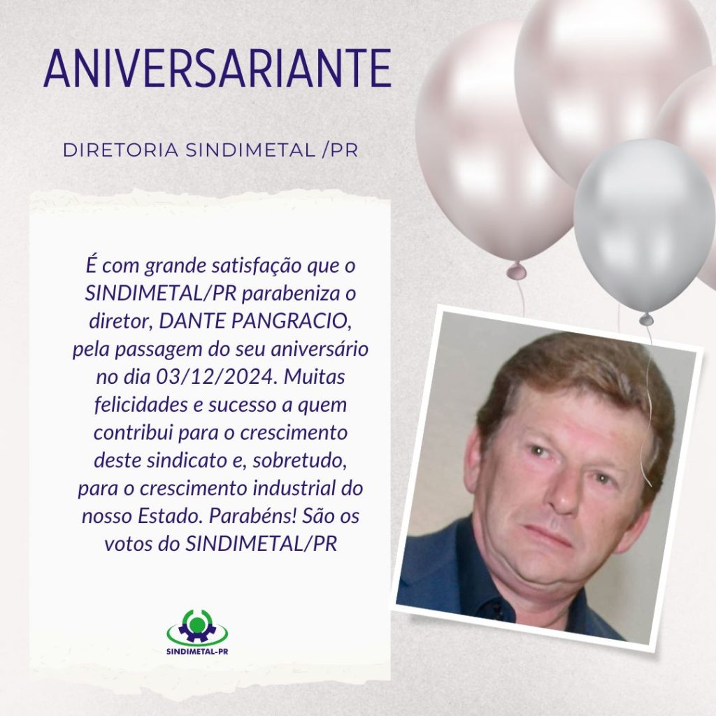 O SINDIMETAL/PR parabeniza o industrial e diretor do SINDIMETAL/PR, Sr. DANTE PANGRACIO pela passagem do seu aniversário!