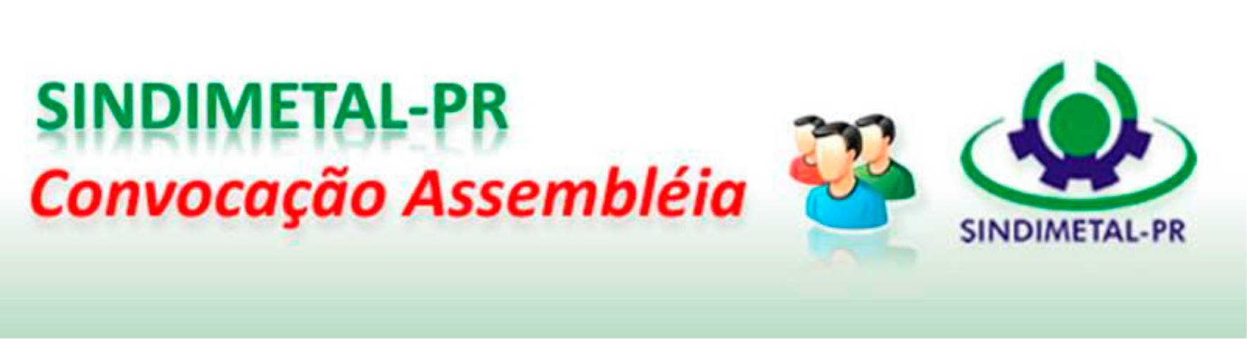 O Sindicato das Indústrias Metalúrgicas, Mecânicas e de Material Elétrico do Estado do Paraná – SINDIMETAL/PR, convoca pelo presente os seus associados, para participarem da ASSEMBLÉIA GERAL ORDINÁRIA, que será realizada na sede do SINDIMETAL, na Rua Ângelo Greca, nº 70, nesta Capital, no próximo dia 10 (dez) de março de 2015, as 17h00min em primeira convocação, ou as 17h30min em segunda convocação.