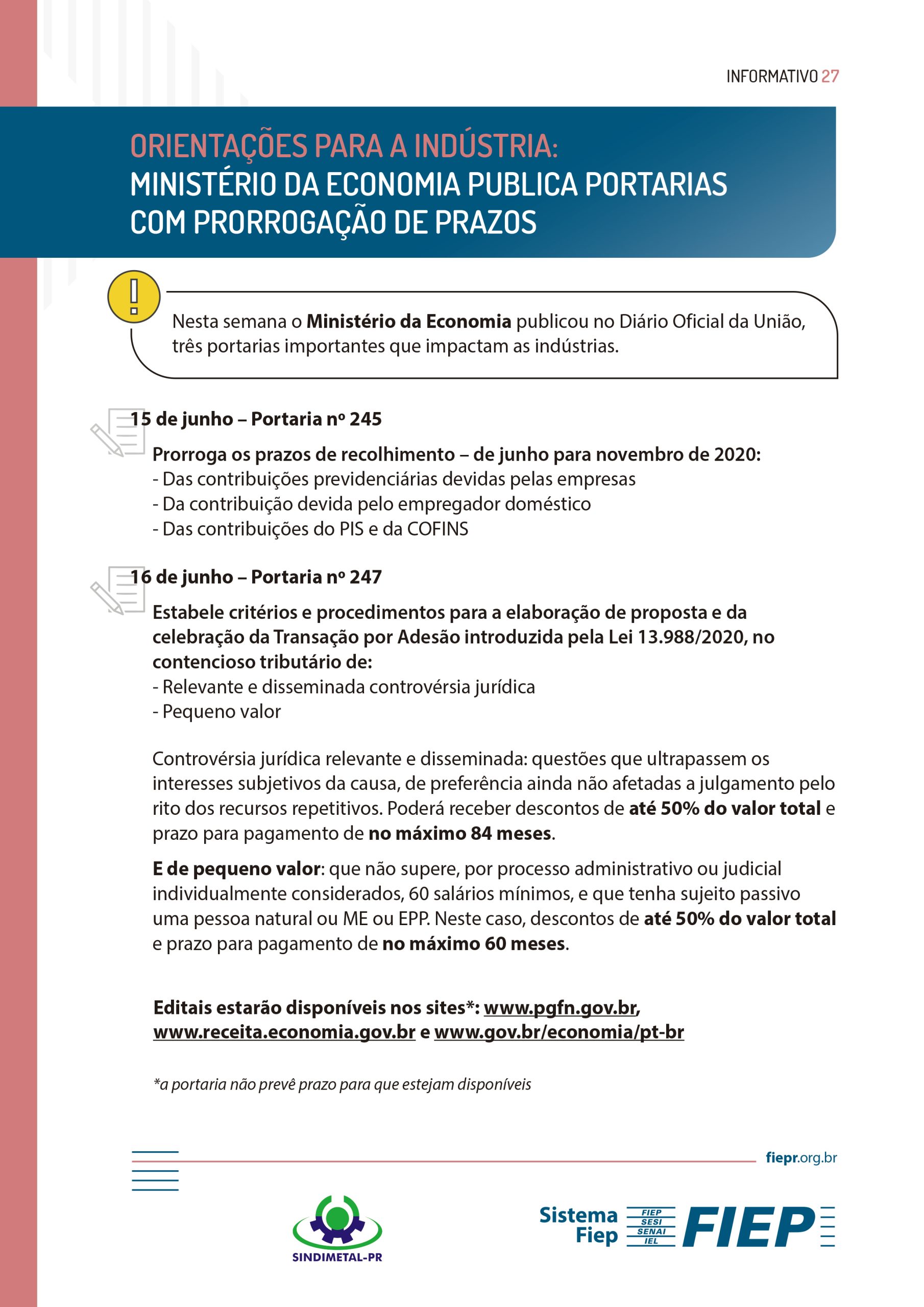 O  SINDIMETAL/PR divulga o informativo do Sistema Fiep que trata das recentes portarias publicadas pelo Ministério da Economia. São três importantes portarias que tratam de prorrogação de prazos em caráter excepcional.