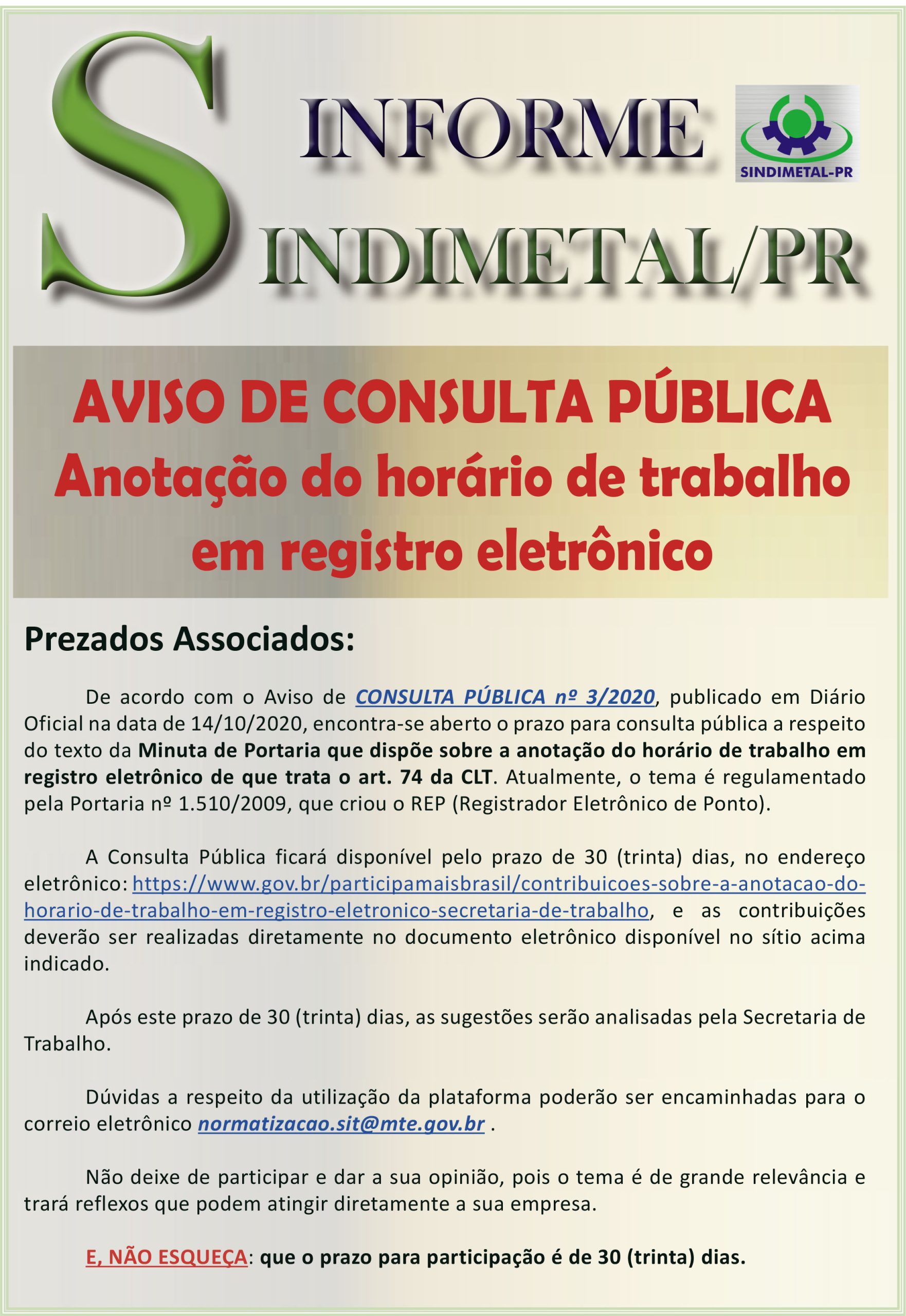 Em caso de dúvidas a respeito da utilização da plataforma, encaminhe para o seguinte e-mail : normatizacao.sit@mte.gov.br