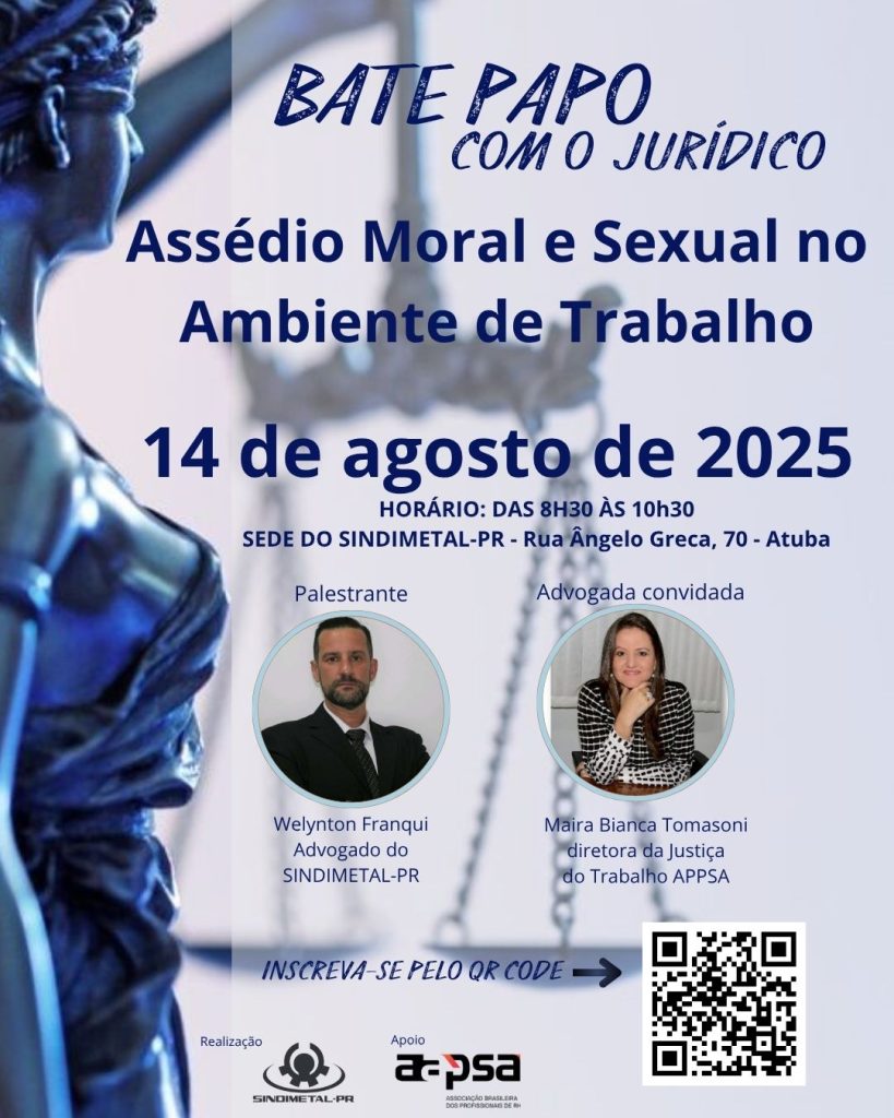 O SINDIMETAL-PR convida associados e filiados para participar de um Bate Papo Jurídico sobre o tema “Assédio Moral e Sexual no Ambiente de Trabalho” — um tema importante e que impacta diretamente a saúde emocional, produtividade e o clima organizacional das empresas.
