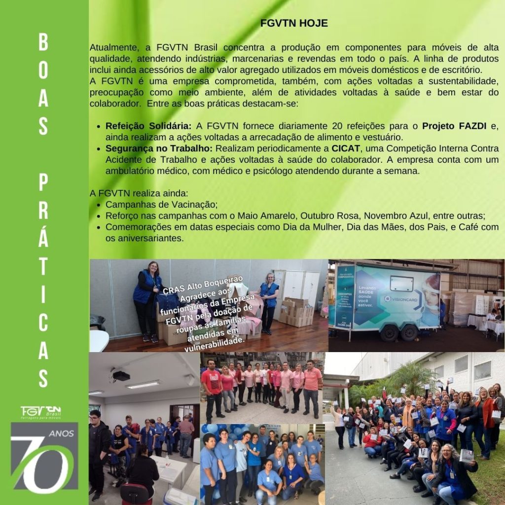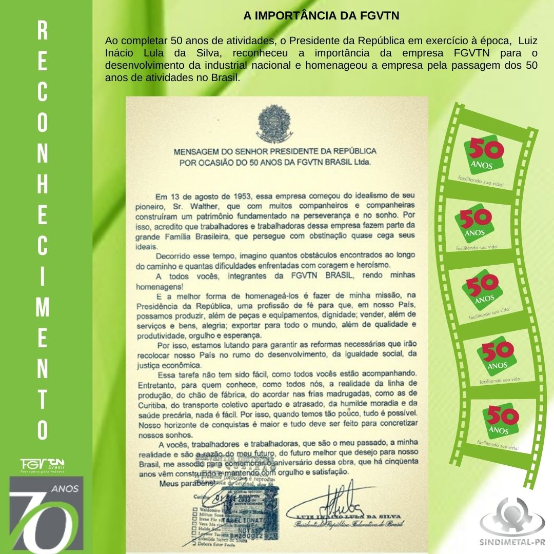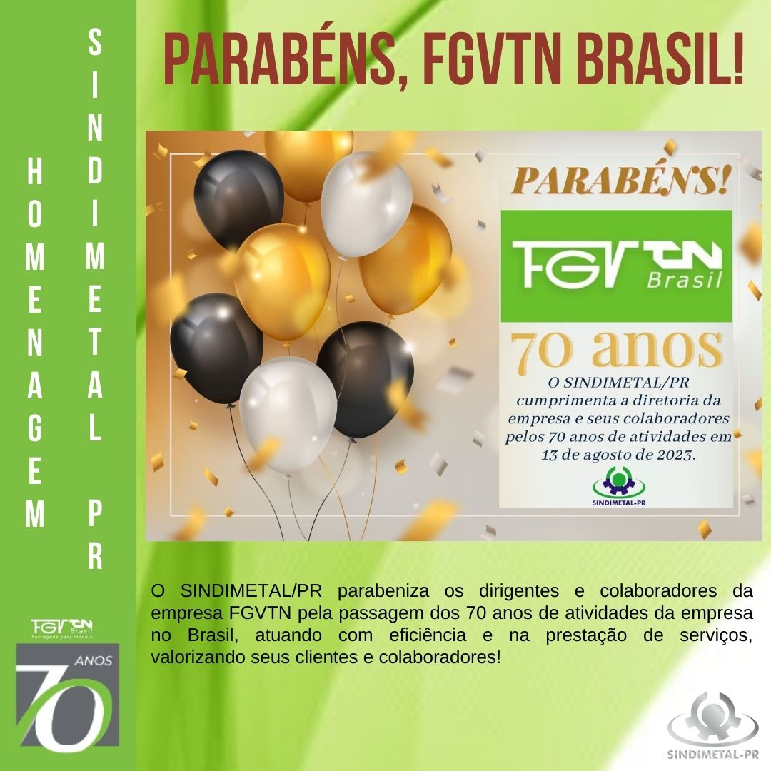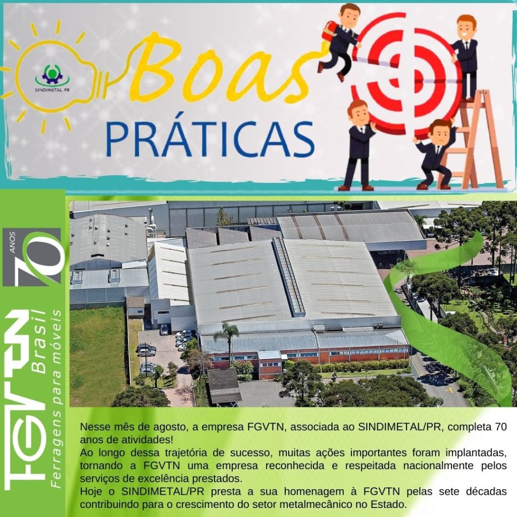 O “Boas Práticas SINDIMETAL/PR” de hoje reconhece o trabalho da empresa FGVTN! Nesse dia 13 de agosto , a empresa completa 70 anos de atividades em prol do desenvolvimento do setor metalmecânico no Estado. PARABÉNS,FGVTN!