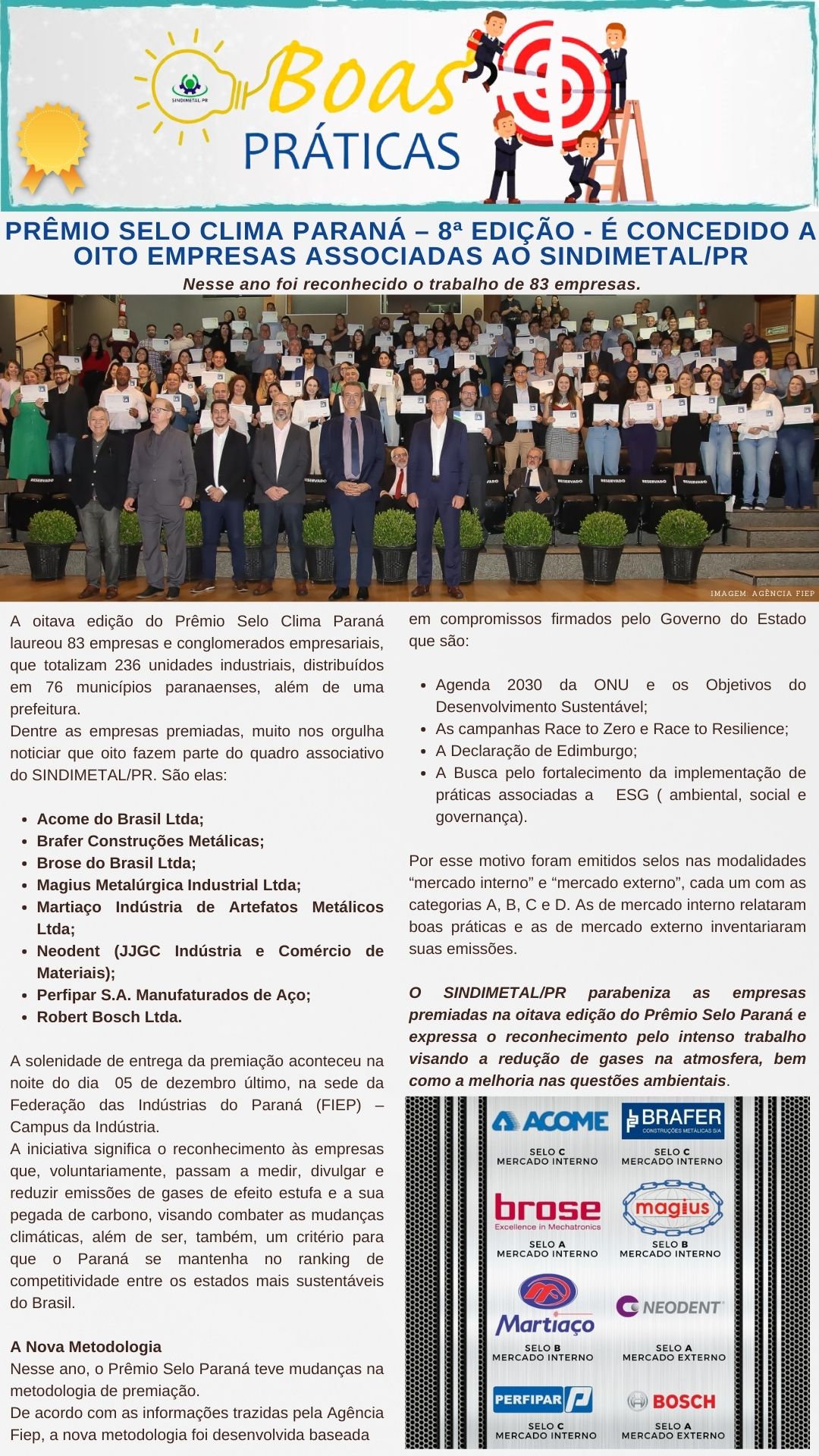 BOAS PRÁTICAS SINDIMETAL/PR: PRÊMIO SELO CLIMA PARANÁ – 8ª EDIÇÃO – É CONCEDIDO A OITO EMPRESAS ASSOCIADAS AO SINDIMETAL/PR