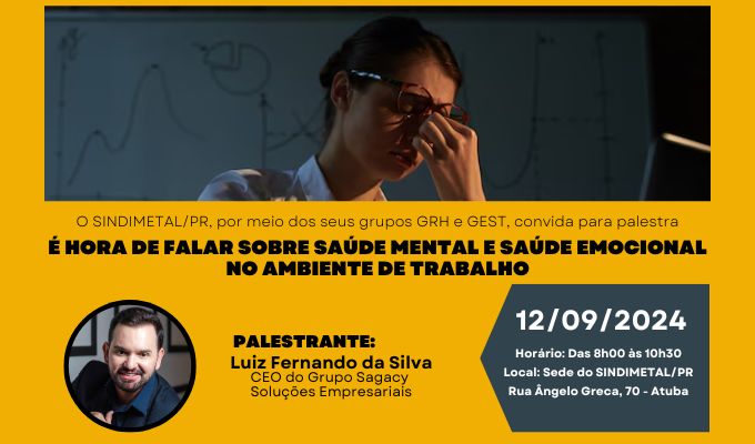 Notícias FAÇA AGORA A SUA INSCRIÇÃO!!PALESTRA SOBRE SAÚDE MENTAL E SAÚDE EMOCIONAL NO AMBIENTE DE TRABALHO Veja mais 09/09/2024