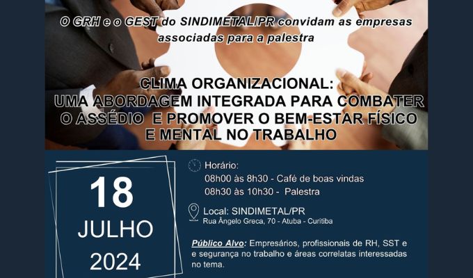 Notícias É AMANHÃ! PALESTRA ” CLIMA ORGANIZACIONAL: UMA ABORDAGEM INTEGRADA PARA COMBATER O ASSÉDIO E PROMOVER O BEM-ESTAR FÍSICO E MENTAL NO TRABALHO Veja mais 17/07/2024