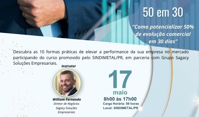 Notícias CURSO: “50 EM 30 – COMO POTENCIALIZAR 50% DE EVOLUÇÃO COMERCIAL EM 30 DIAS” Veja mais 02/05/2024