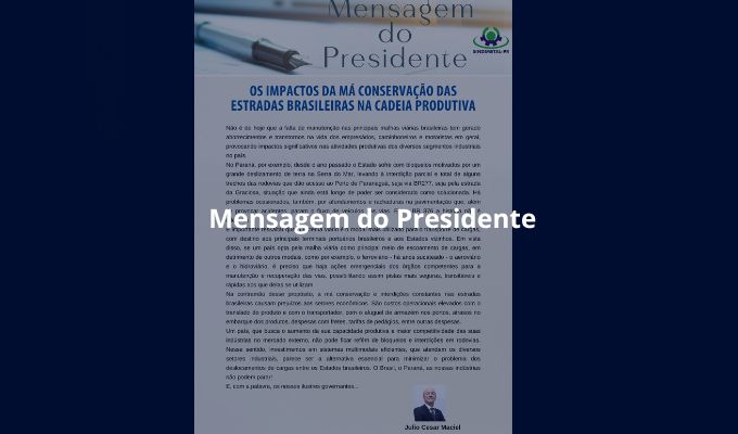 Mensagem do Presidente MENSAGEM DO PRESIDENTE: OS IMPACTOS DA MÁ CONSERVAÇÃO DAS ESTRADAS BRASILEIRAS NA CADEIA PRODUTIVA Veja mais 25/04/2023