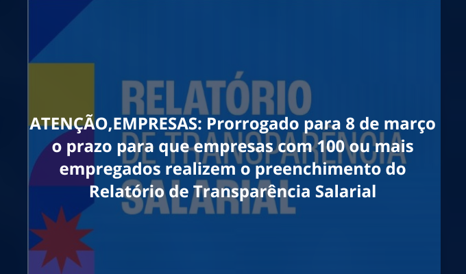 Notícias ATENÇÃO, EMPRESAS: Prorrogado para 8 de março o prazo para que empresas com 100 ou mais empregados realizem o preenchimento do Relatório de Transparência Salarial Veja mais 29/02/2024