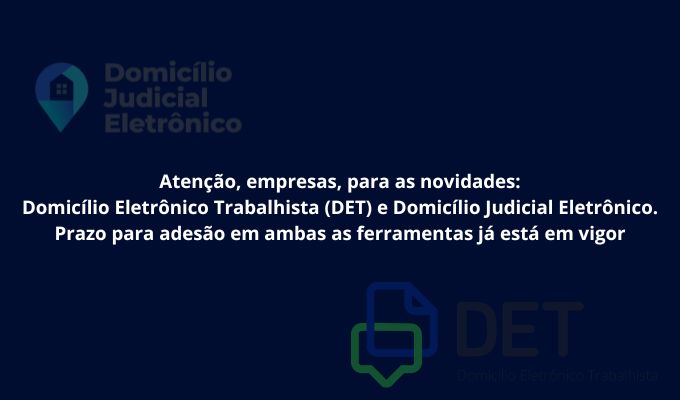 Notícias ATENÇÃO, EMPRESAS, PARA AS NOVIDADES: DOMICÍLIO ELETRÔNICO TRABALHISTA (DET) E DOMICÍLIO JUDICIAL ELETRÔNICO – PRAZO PARA ADESÃO EM AMBAS AS FERRAMENTAS JÁ ESTÁ EM VIGOR Veja mais 04/03/2024