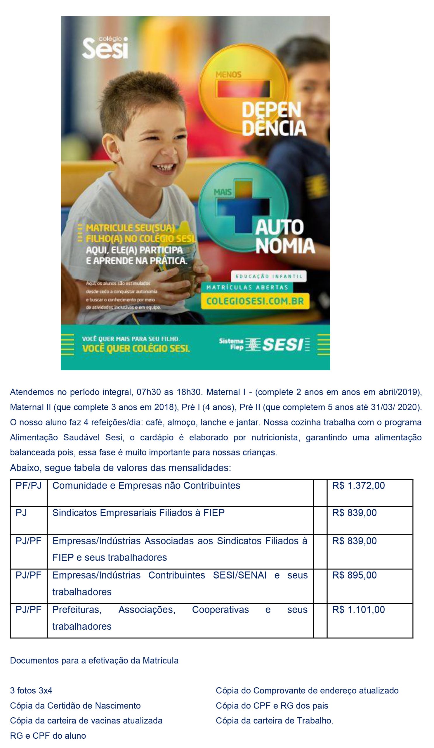 ENSINO EDUCAÇÃO INFANTIL / SESI PORTÃO – Início 2019