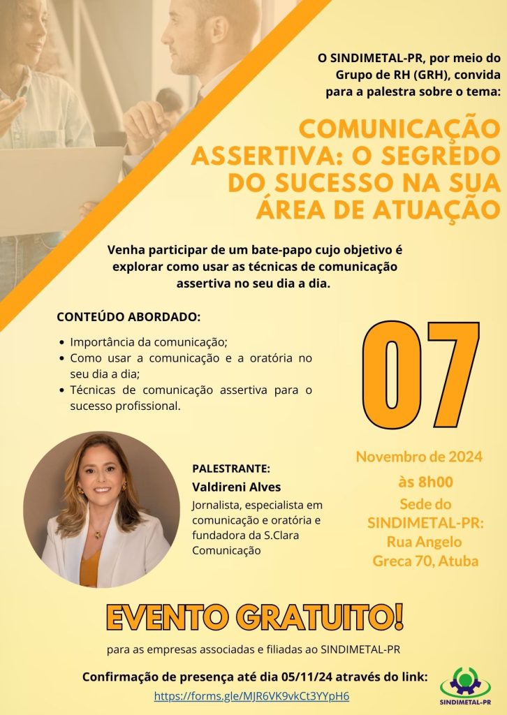 O SINDIMETAL-PR, em conjunto o Grupo de RH (GRH), promove um evento sobre o tema “Comunicação Assertiva: O Segredo do Sucesso na sua Área de Atuação”. Ministrada por Valdireni Alves, fundadora da S.Clara Comunicação, a palestra tem como objetivo mostrar como utilizar as técnicas de comunicação assertiva no dia a dia.
