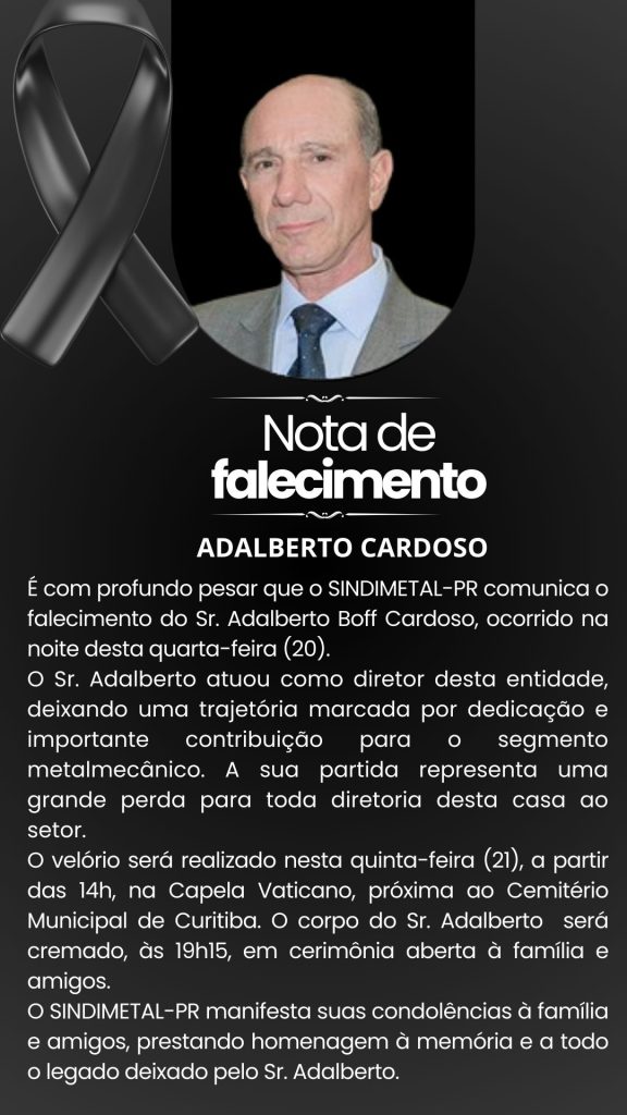A diretoria e toda a equipe do SINDIMETAL-PR manifestam suas condolências à família e aos amigos, rendendo homenagem à memória do Sr. Adalberto Boff Cardoso e ao legado construído à frente do SINDIMTAL-PR e da empresa Magius.