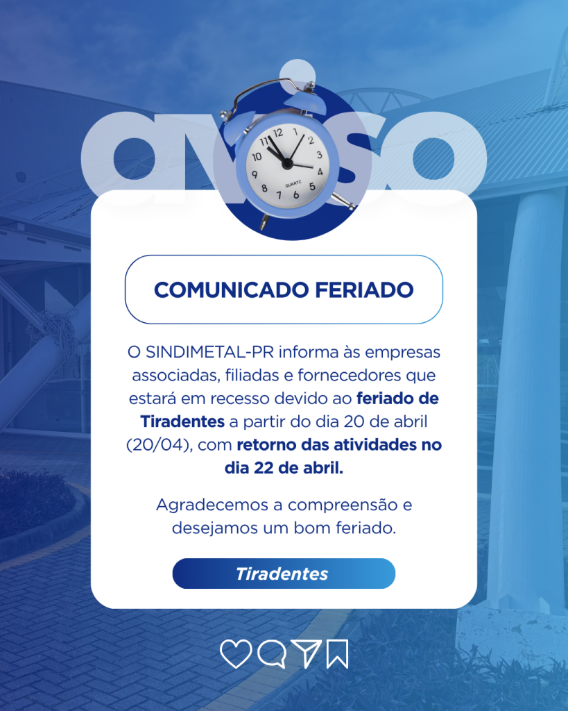 O SINDIMETAL-PR informa às empresas associadas, filiadas e fornecedores que estará em recesso devido ao feriado de Tiradentes a partir do dia 20 de abril (20/04), com retorno das atividades no dia 22 de abril de 2026