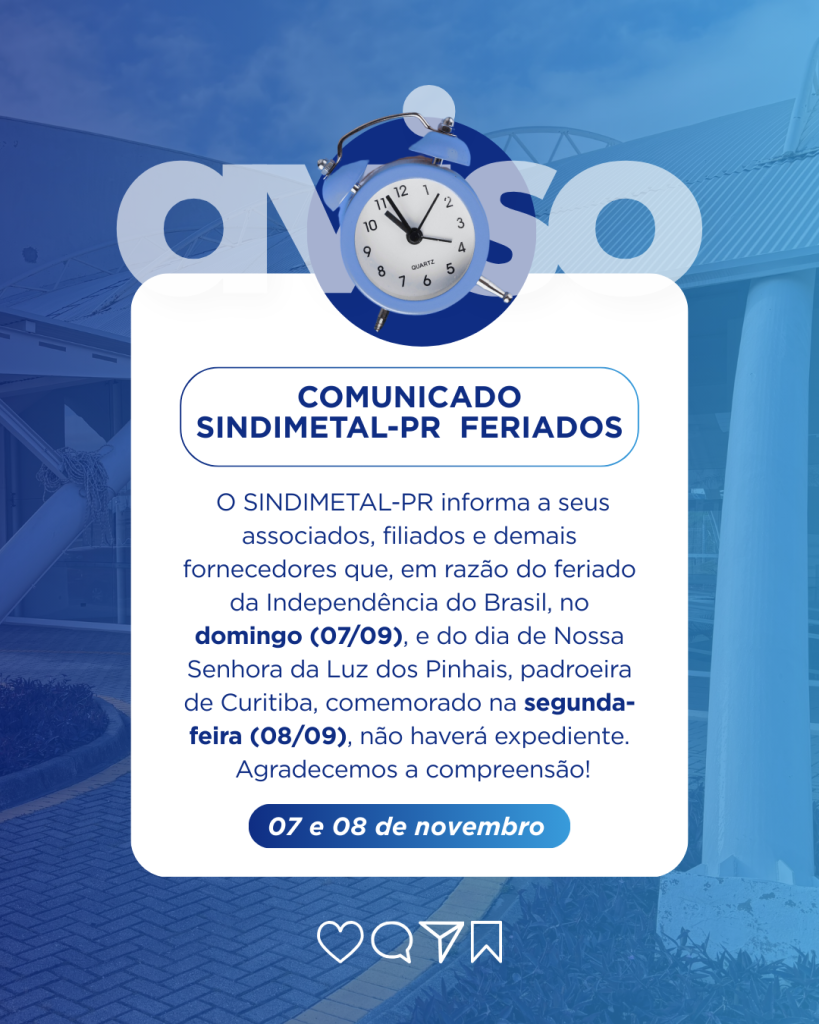 O SINDIMETAL-PR informa a seus associados, filiados e demais fornecedores que, em razão do feriado da Independência do Brasil, no domingo (07/09), e do dia de Nossa Senhora da Luz dos Pinhais, padroeira de Curitiba, comemorado na segunda-feira (08/09), não haverá expediente.