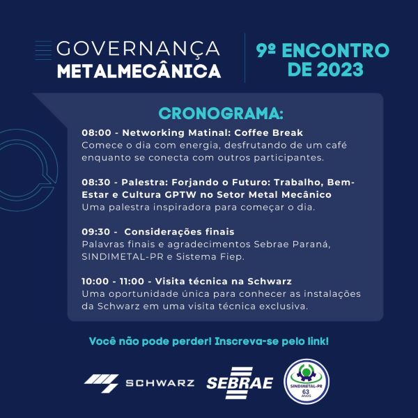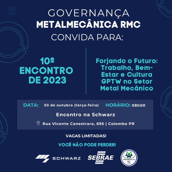 Está chegando mais uma atividade da Governança Metalmecânica RMC 2023! No próximo dia 03 de outubro, os integrantes do grupo participarão do evento presencial na Metalúrgica Schwarz!