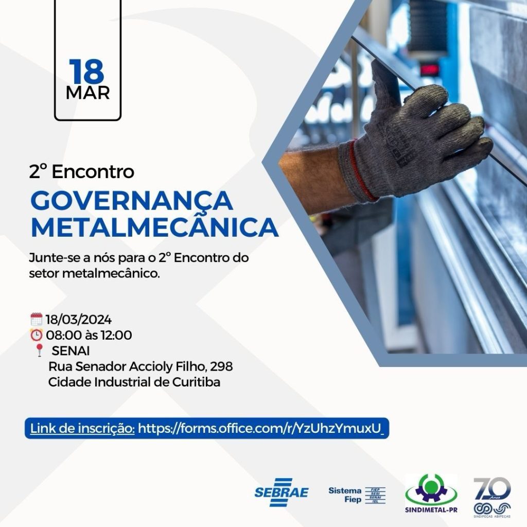 A Governança Metalmecânica é uma iniciativa do SEBRAE/PR– Regional Leste, em parceria com SINDIMETAL/PR, e tem por objetivo promover o desenvolvimento do setor metalmecânico, fortalecendo os atores da cadeia produtiva, com ações estruturantes e estratégicas de crescimento sustentável.