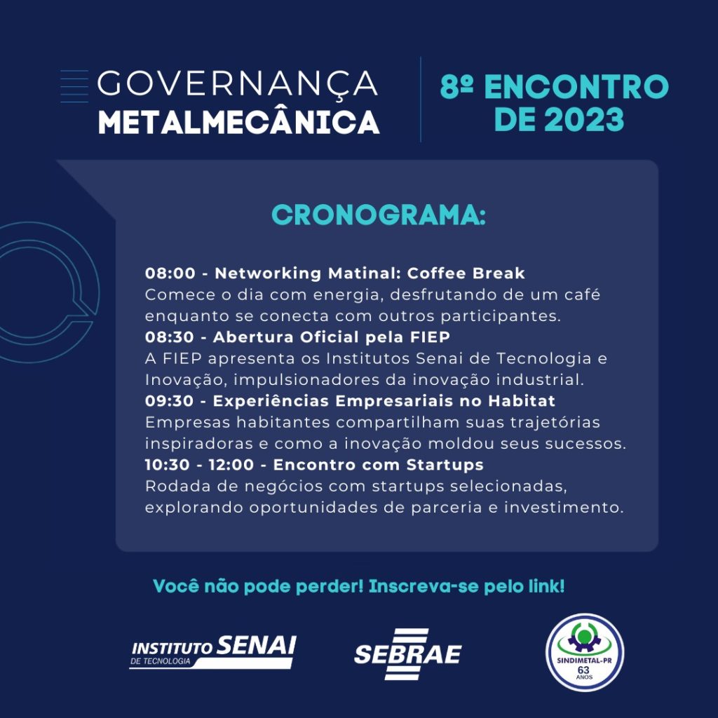 O SINDIMETAL/PR divulga e convida todos os seus associados para participarem do 8º Encontro da Governança Metalmecânica da RMC -2023.