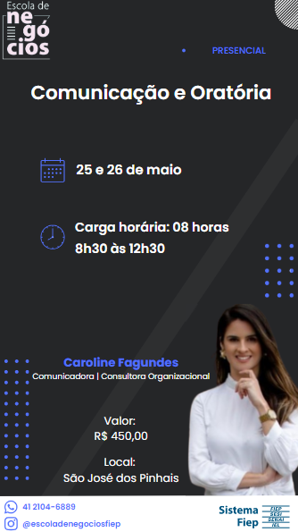 O SINDIMETAL/PR divulga aos seus associados e filiados o curso de Comunicação e Oratória. A atividade, promovida pela Escola de Negócios do Sistema Fiep, será realizada nos dias 25 e 26 de maio, na Unidade IEL, em São José dos Pinhais.