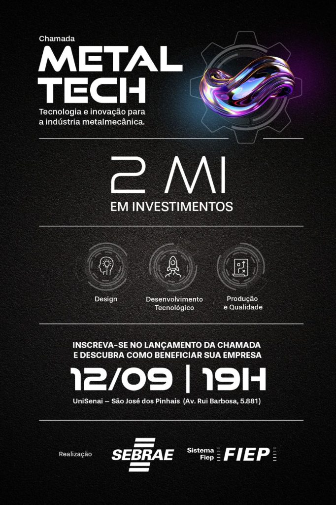 O SINDIMETAL/PR divulga e convida os seus associados para o lançamento da“Chamada Metaltech”, que tem como objetivo promover o aumento da produtividade do segmento metalmecânico nos temas de design, desenvolvimento tecnológico, produção e qualidade.