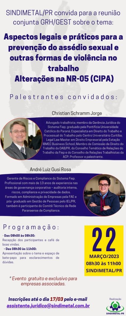 CONVITE: REUNIÃO CONJUNTA GRH/GEST | ASPECTOS LEGAIS E PRÁTICOS PARA A PREVENÇÃO DO ASSÉDIO SEXUAL E OUTRAS FORMAS DE VIOLÊNCIA NO TRABALHO