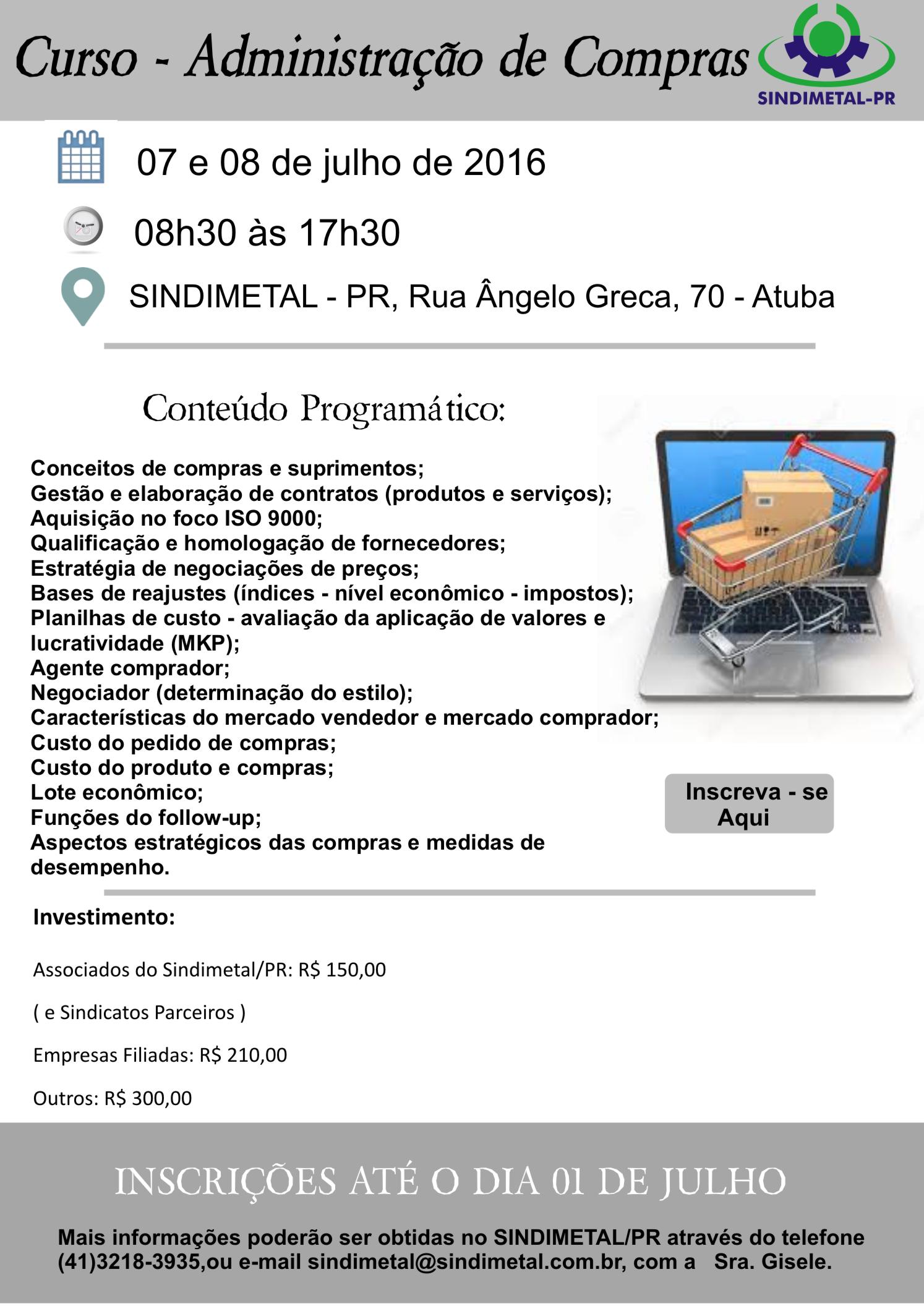O SINDIMETAL/PR convida seus associados e filiados para o Curso – “Administração de Compras”.