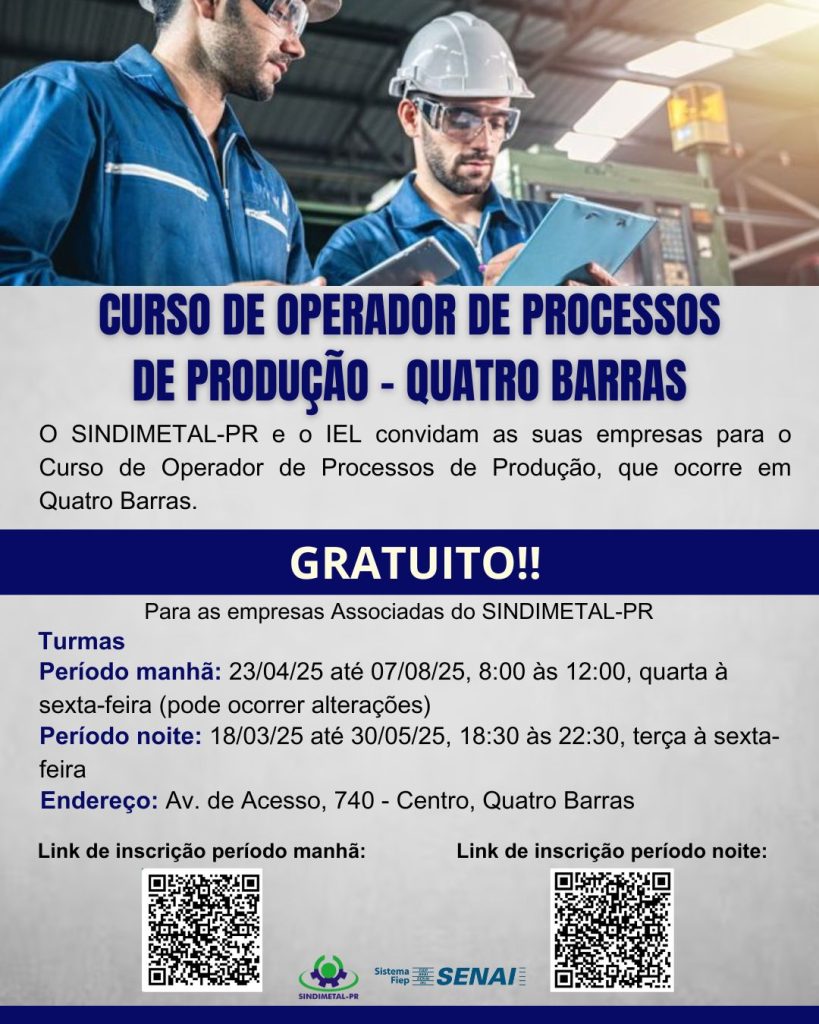 O SINDIMETAL-PR convida para o curso de Operador de Processos de Produção, que ocorrerá em Quatro Barras. Você terá a oportunidade de estudar os conteúdos de Matemática Básica, Metrologia, Leitura e Interpretação de Desenho Técnico, Tecnologia dos Materiais, Tecnologia Mecânica e Gestão Industrial. E, no final do curso, você já tem qualificação profissional para atuar na área!