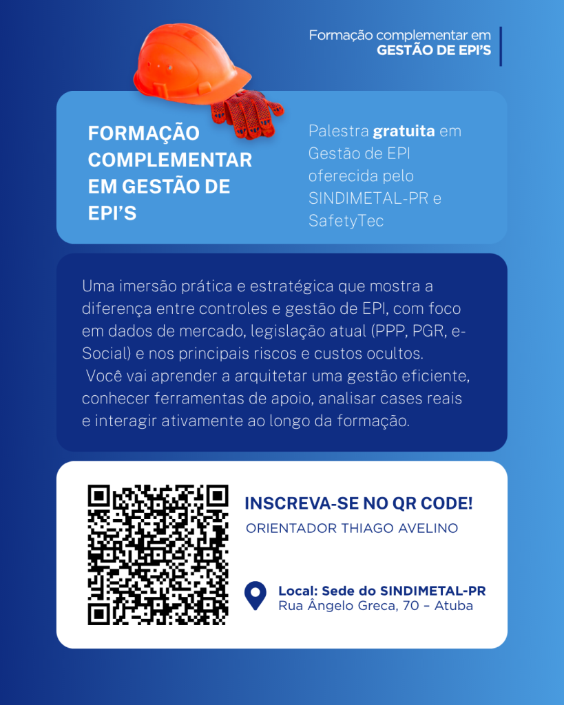 O SINDIMETAL-PR, em parceria com a SafetyTec, realizará no dia 28 de outubro uma palestra gratuita voltada à gestão estratégica de Equipamentos de Proteção Individual (EPI’s). O encontro acontecerá das 8h30 às 11h, na sede do sindicato, em Curitiba.