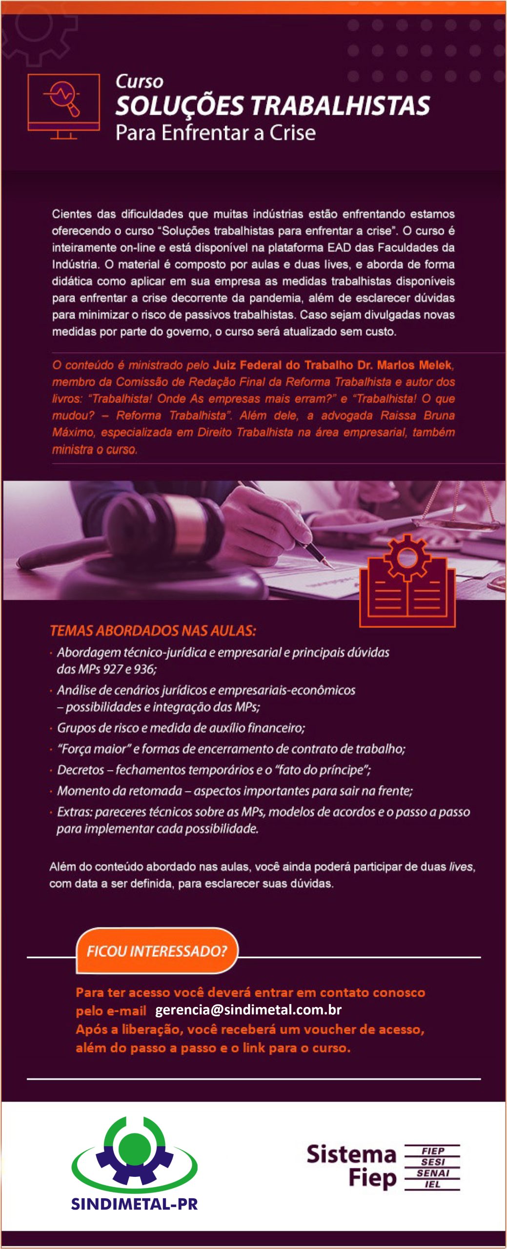 SINDIMETAL/PR, em parceria com o Sistema Fiep, convida para o Curso: SOLUÇÕES TRABALHISTAS Para Enfrentar a Crise