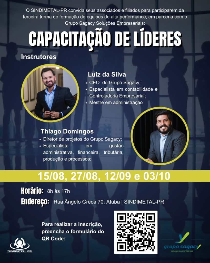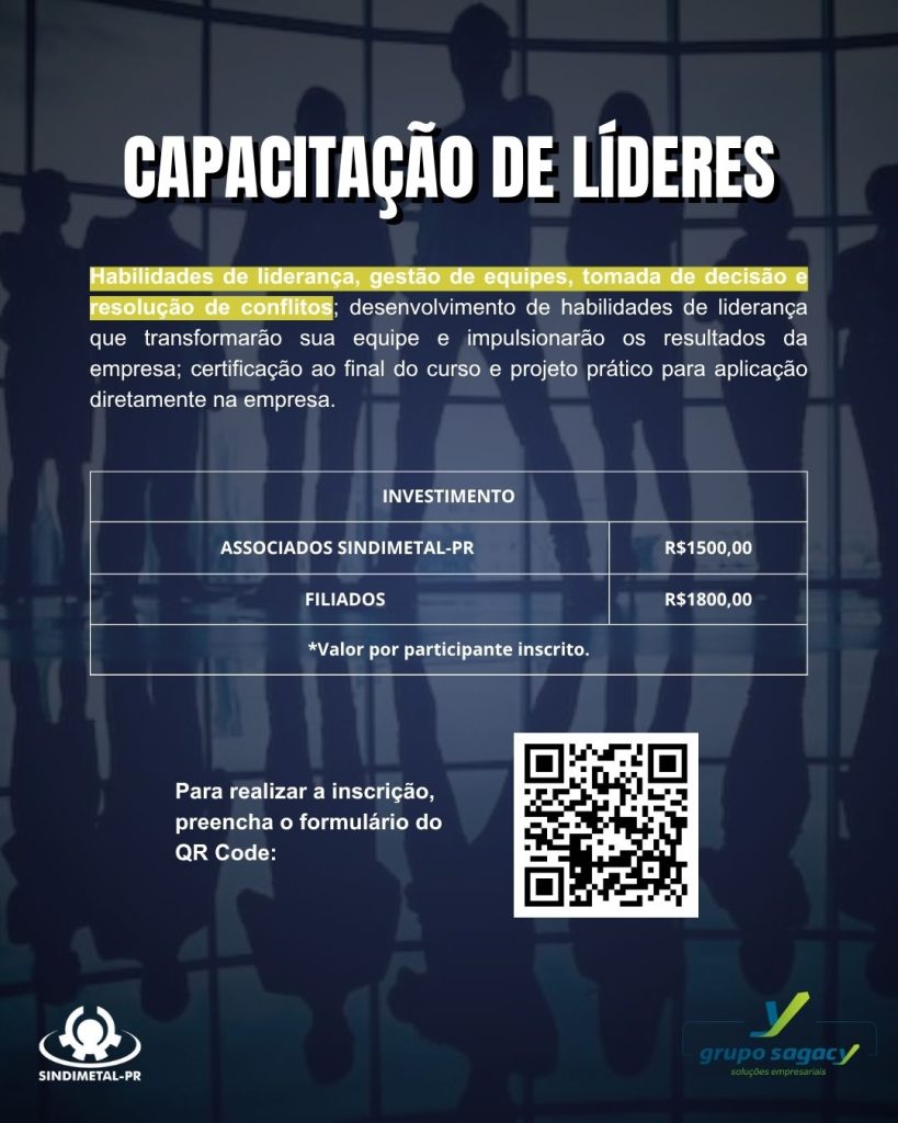 Você já parou para pensar no impacto de uma liderança bem preparada para o seu negócio? Um bom líder inspira, organiza, desenvolve pessoas e move a empresa rumo ao crescimento sustentável. Ciente dessa importância, o SINDIMETAL-PR, em parceria com o Grupo Sagacy, promove pela terceira vez consecutiva o curso “Capacitação de Líderes de Alta Performance”, uma atividade para quem deseja liderar com propósito e estratégia.