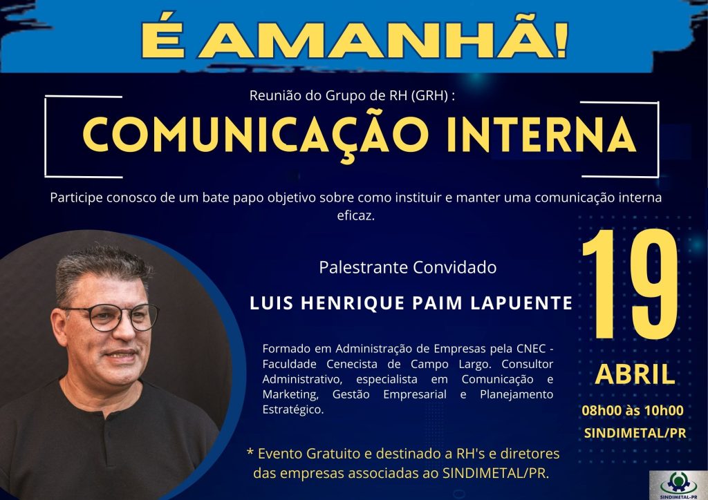 Amanhã temos um encontro marcado na sede do SINDIMETAL/PR. O Grupo de RH do SINDIMETAL/PR do mês de abril debaterá o tema: “Comunicação Interna”, palestra ministrada pelo especialista em Comunicação e Marketing, Gestão Empresarial e Planejamento Estratégico, Luis Henrique Paim Lapuente.