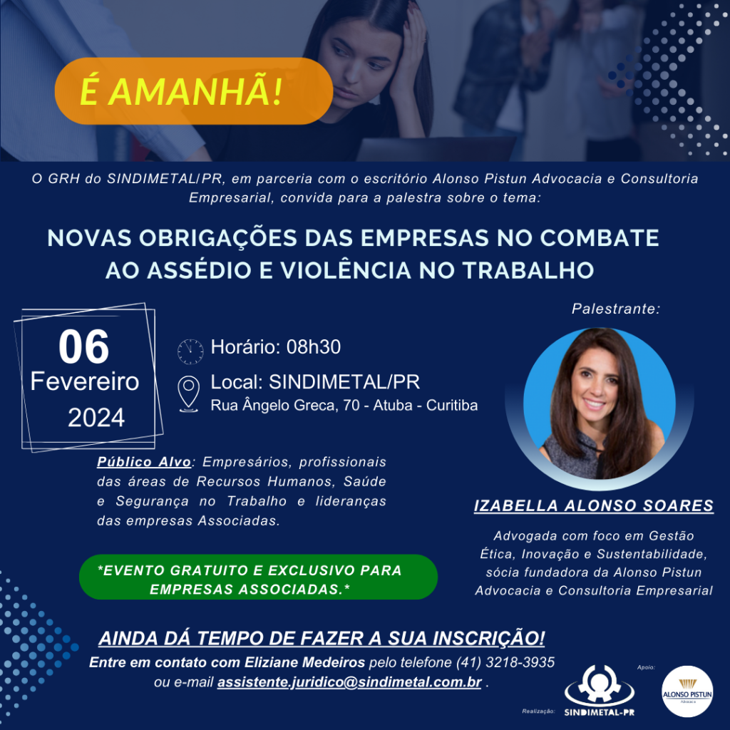 É AMANHÃ! PALESTRA: NOVAS OBRIGAÇÕES DAS EMPRESAS NO COMBATE AO ASSÉDIO E VIOLÊNCIA NO TRABALHO