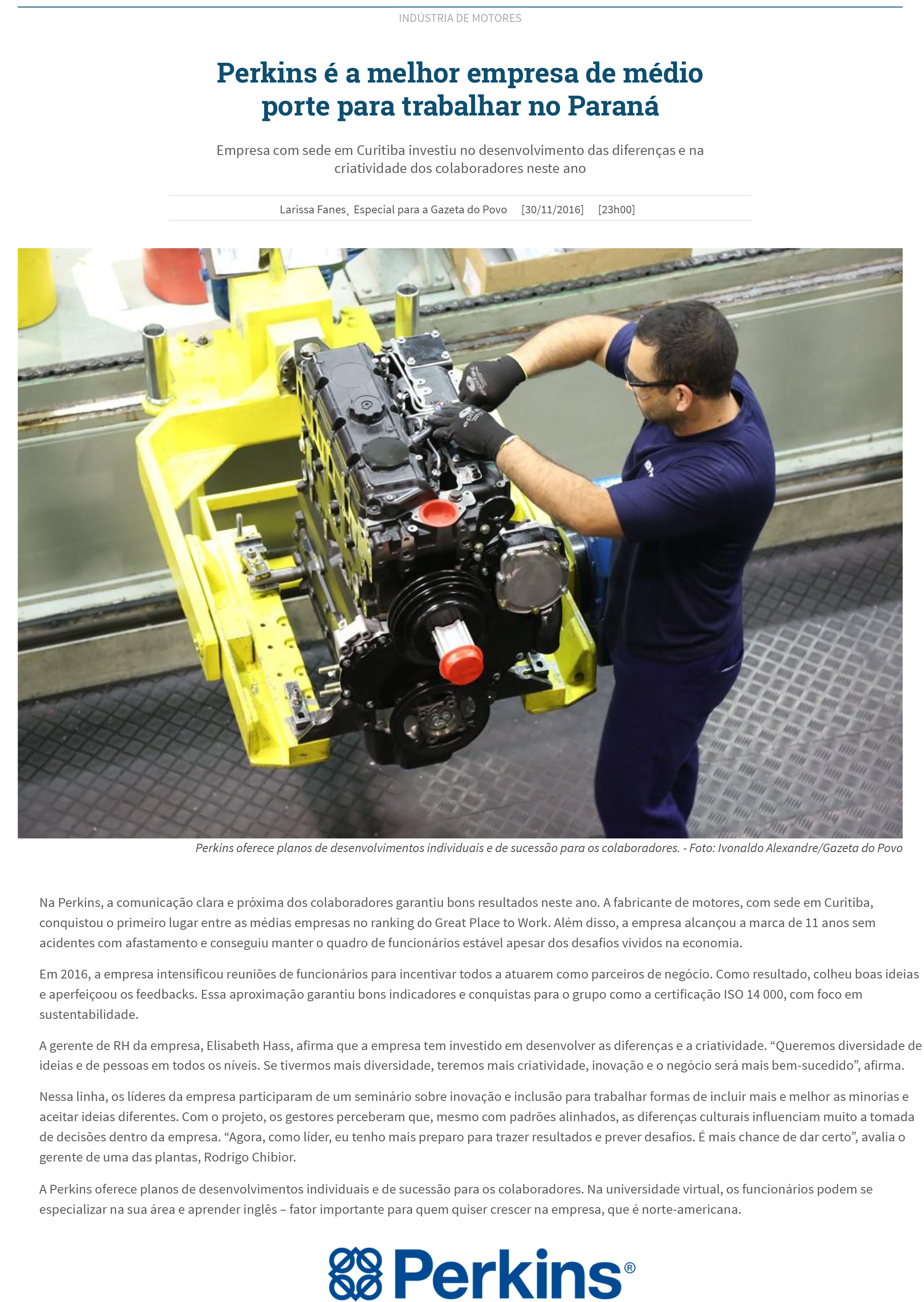 O SINDIMETAL/PR homenageia e parabeniza a “Perkins Motores do Brasil LTDA.”, empresa associada ao sindicato, pela conquista de melhor empresa de médio porte para trabalhar, de acordo com a 7ª edição do estudo “As 35 Melhores Empresas para Trabalhar – Paraná 2016”, realizado pelo Great Place to Work, em parceria com a Gazeta do Povo.