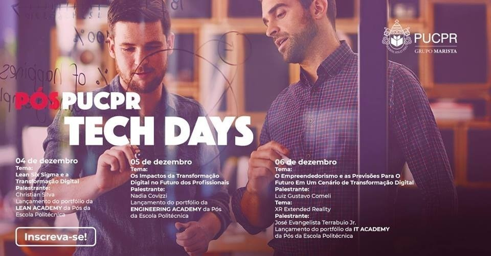 A PUCPR convida para o evento Tech Days 2018, com diversas palestras relacionadas à transformação digital e inovação nas áreas de Tecnologia e Engenharia. O evento também possui como objetivo apresentar a estrutura de Educação Continuada da Escola Politécnica, com Engeneering Academy, IT Academy e Lean Academy.