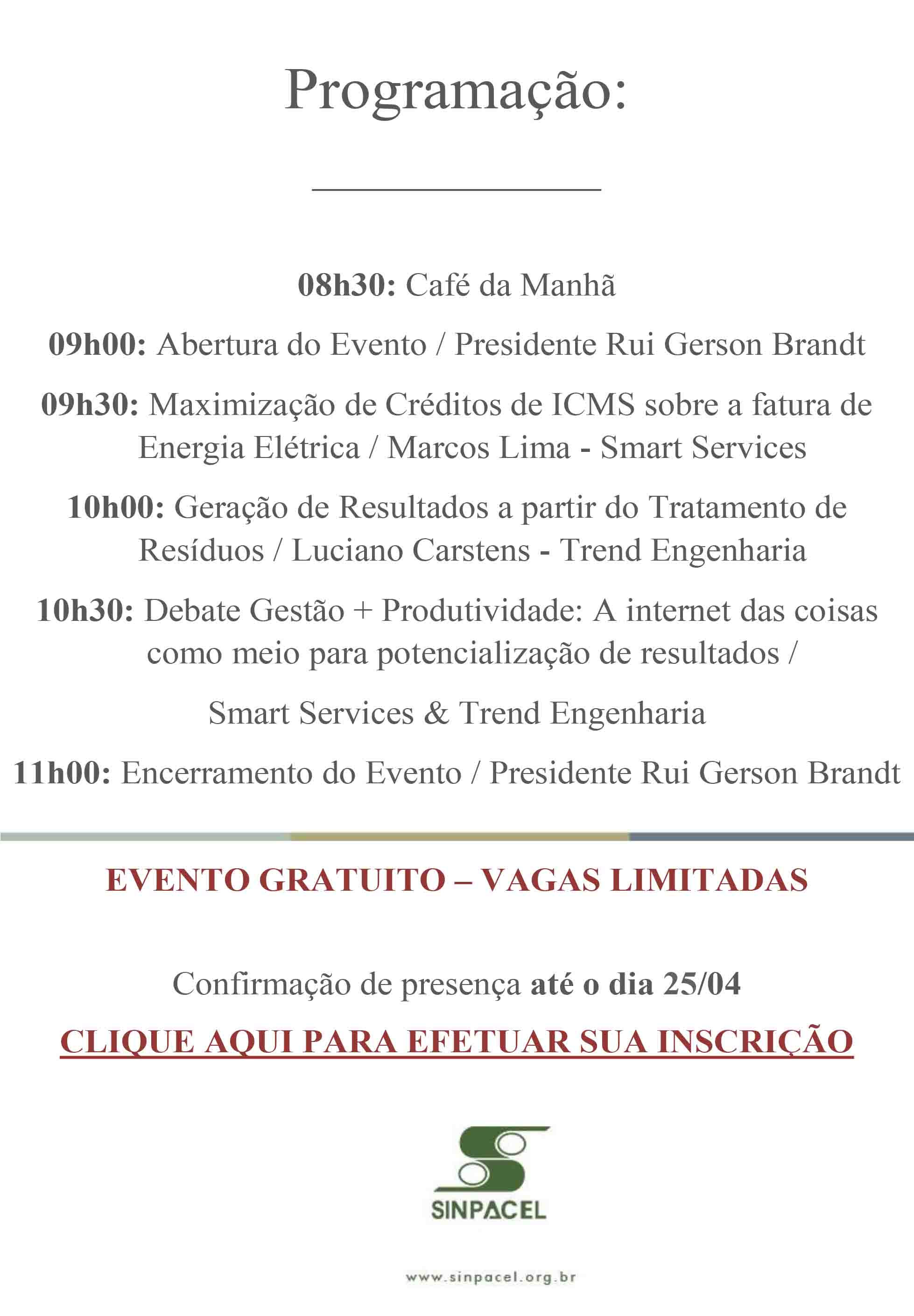 Elétrica e do Tratamento de Resíduos” que será realizado no dia 27/04, no auditório do Sinpacel. O evento é gratuito, e as inscrições são online, basta clicar no próprio convite.