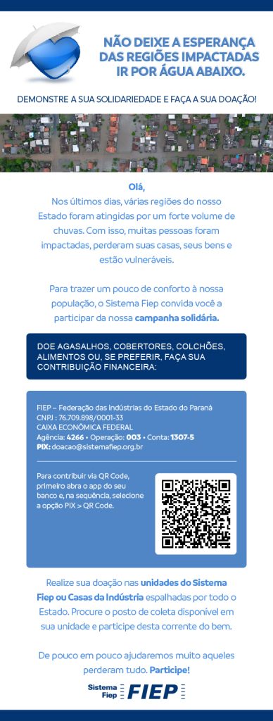 O SINDIMETAL-PR divulga a campanha da Fiep que visa ajudar as famílias vítimas das enchentes no Estado.