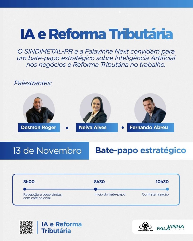 Aproveitamos para reforçar o convite para este bate-papo estratégico com duas palestras sobre temas estratégicos: o uso da Inteligência Artificial na gestão de negócios e os impactos da Reforma Tributária no trabalho. O encontro será realizado na sede do Sindimetal-PR, na Rua Ângelo Greca, 70, bairro Atuba, em Curitiba, dia 13/11, a partir das 8h, com recepção e café colonial.