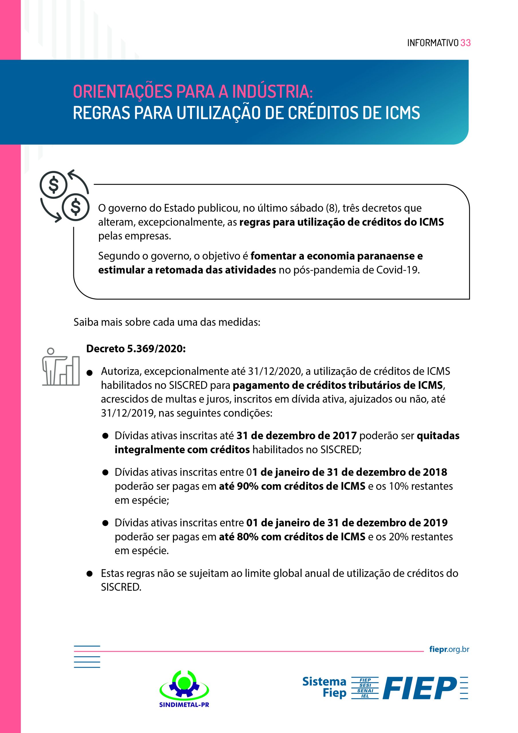 O SINDIMETAL/PR divulga informativo da FIEP que trata de três decretos que alteram, excepcionalmente, as regras para utilização de créditos do ICMS pelas empresas. Segundo o governo, o objetivo é fomentar a economia paranaense e estimular a retomada das atividades no pós-pandemia de Covid-19.