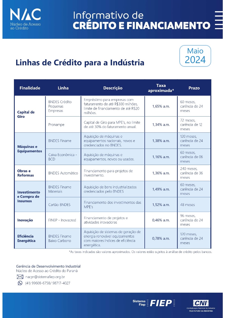 Confira o Informativo de Crédito e Financiamento do Sistema Fiep do mês de Maio. No documento, estão presentes as condições das principais linhas para a indústria.