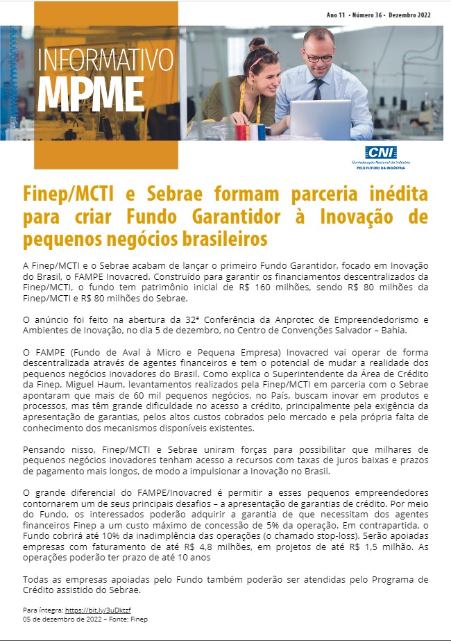 O SINDIMETAL/PR divulga Informativo MPME – edição nº 36 – dezembro de 2022, elaborado pela CNI e que destaca a notícia: