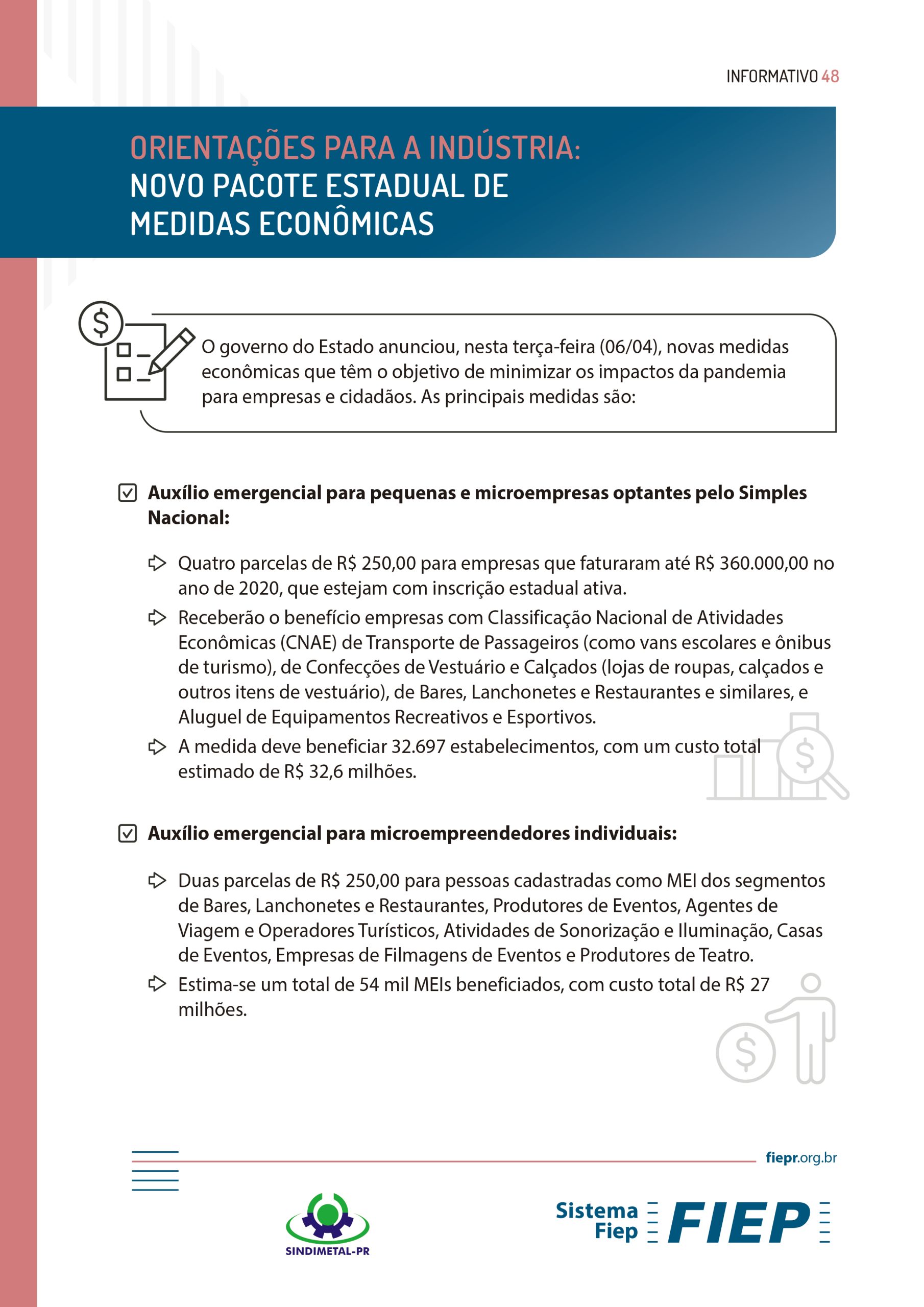 O SINDIMETAL/PR divulga o boletim “Orientações para a Indústria”, elaborado pela Fiep, o qual informa sobre as novas medidas econômicas anunciadas pelo Governo do Estado, que têm o objetivo de minimizar os impactos da pandemia.