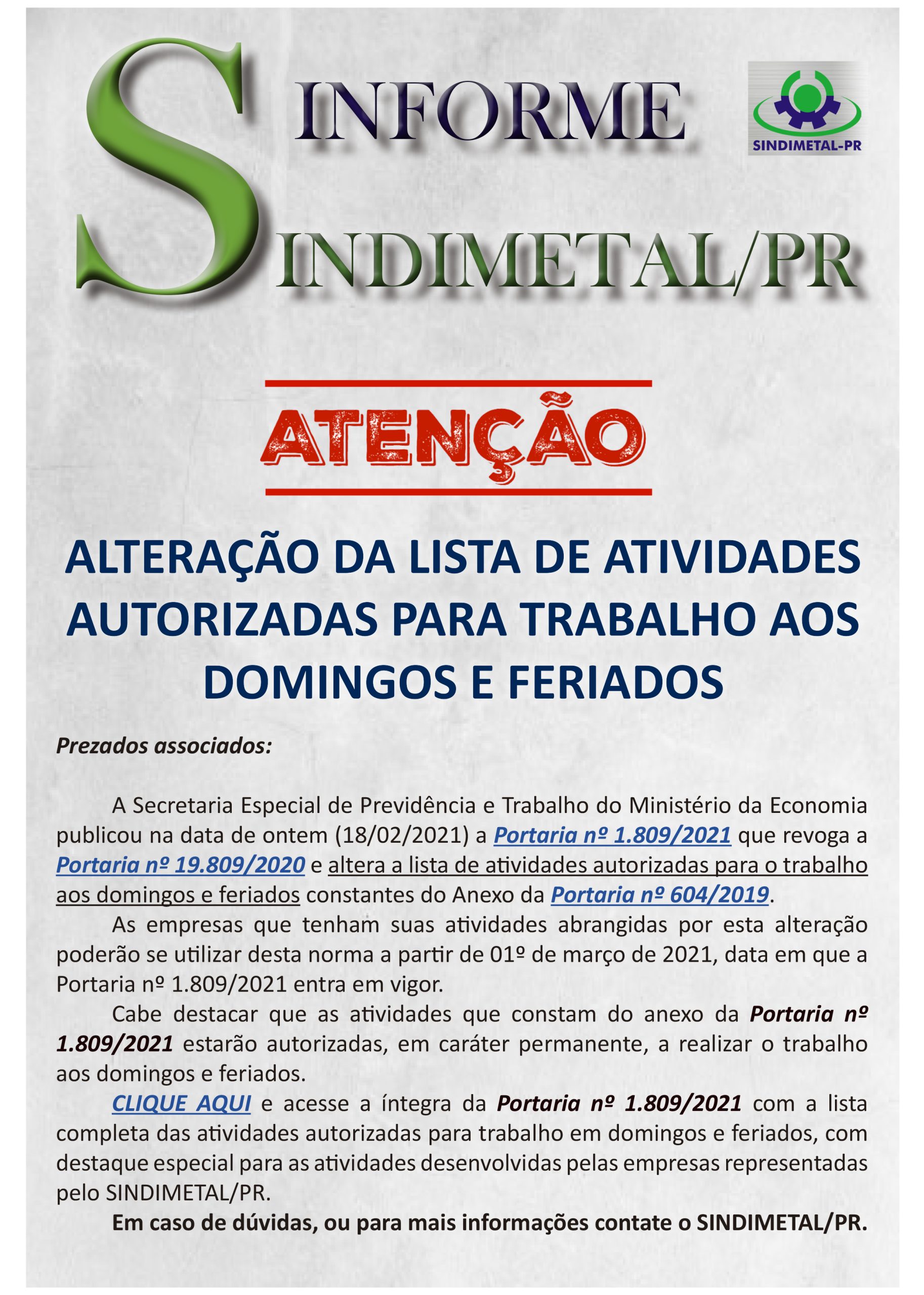 INFORME SINDIMETAL/PR: ALTERAÇÃO DA LISTA DE ATIVIDADES AUTORIZADAS PARA TRABALHO AOS DOMINGOS E FERIADOS