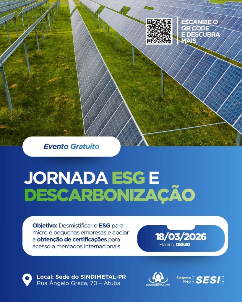 Para garantir que a indústria paranaense lidere este novo cenário, o SINDIMETAL-PR, em parceria com o SESI, convida os profissionais da sua empresa para o evento” Jornada ESG e Descarbonização“.