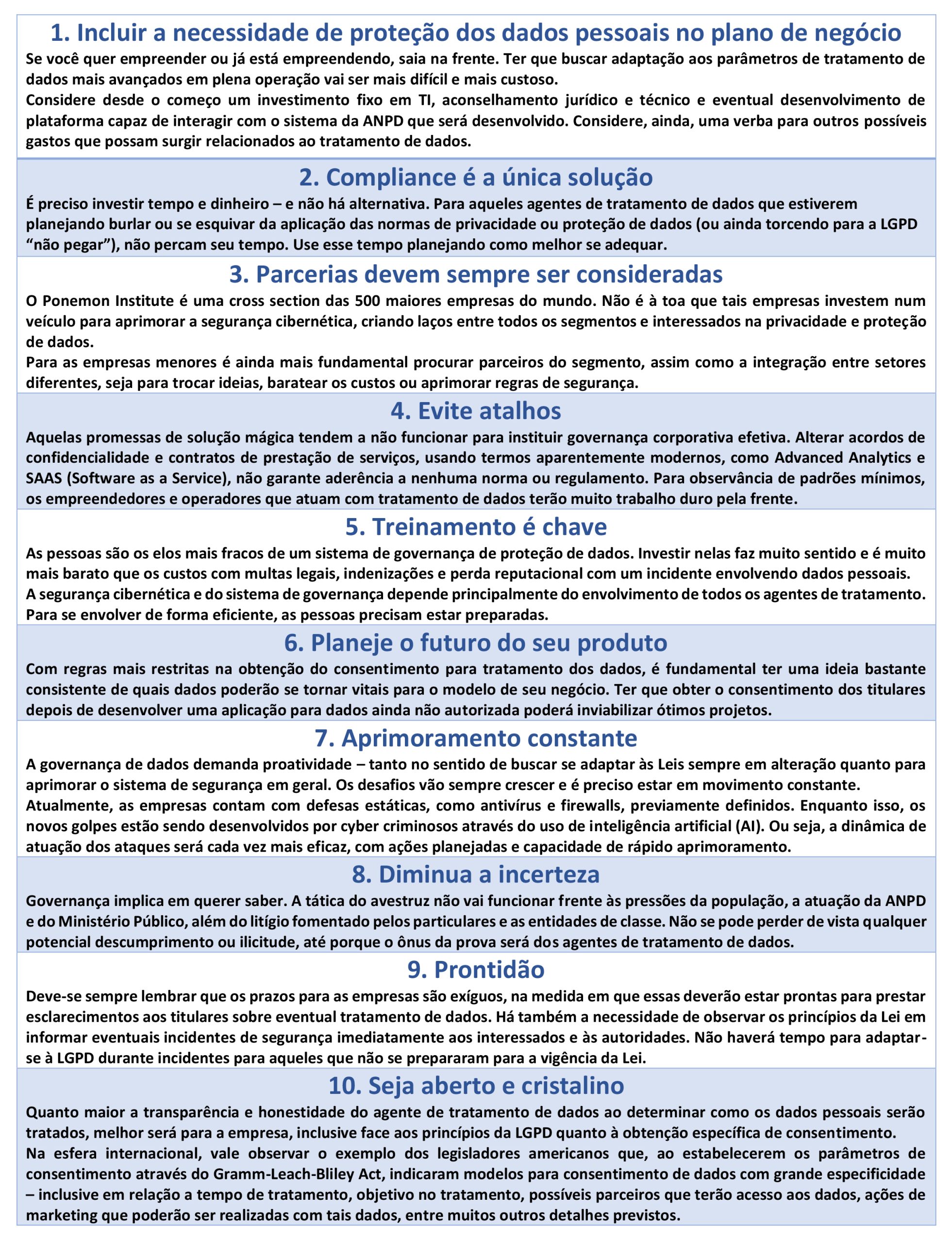 E, como parâmetros mínimos a serem observados, Dr. Paulo de Tarso traz como sugestão 10 pontos fundamentais para cumprimento das exigências legais[2], sendo eles: