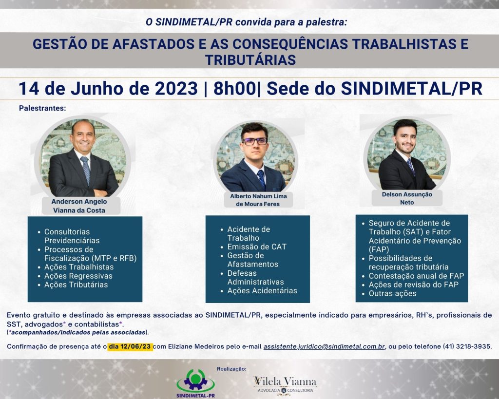 Saiba como fazer uma gestão eficiente de afastados reduzindo as consequências trabalhistas e tributárias em evento que será realizado pelo SINDIMETAL/PR, em parceria com o escritório Vilela Vianna Advocacia e Consultoria, no próximo dia 14 de junho.