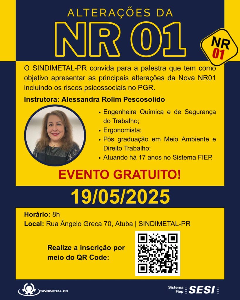 Pensando nessa mudança, o SINDIMETAL-PR convida seus associados e filiados para a palestra “Alterações na NR 01”, para situar as empresas das principais alterações e, também, como adaptar a gestão do ambiente de trabalho de acordo com a norma.