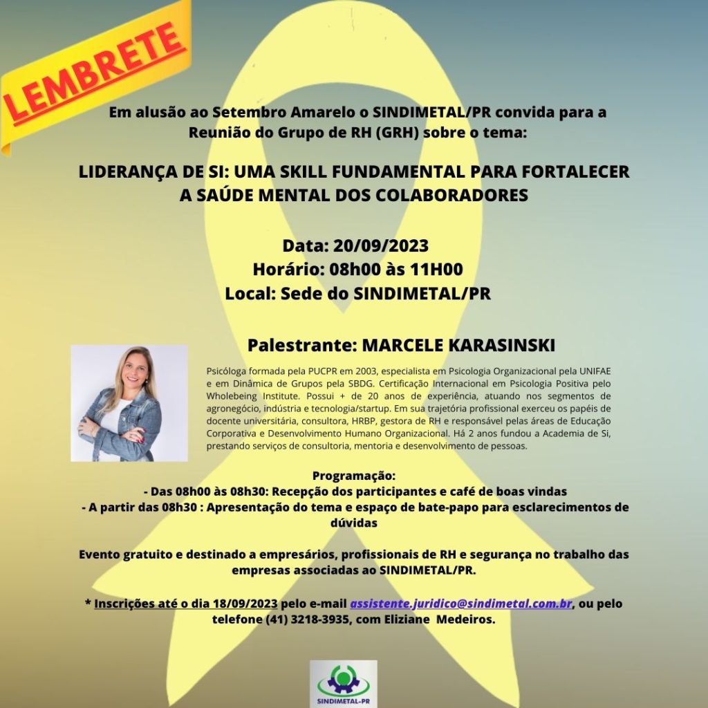 O SINDIMETAL/PR, através do seu Grupo de RH, promoverá reunião na qual serão debatidos aspectos relacionados ao autoconhecimento, liderança e cuidados a serem observados para o fortalecimento da saúde mental dos colaboradores.