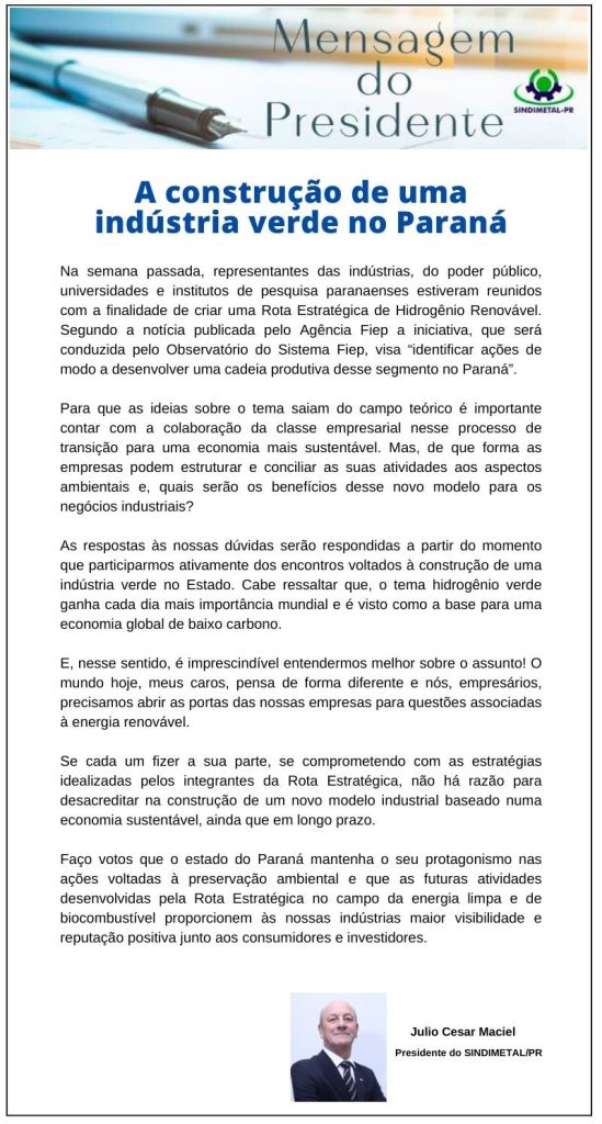 MENSAGEM DO PRESIDENTE: “A CONSTRUÇÃO DE UMA INDÚSTRIA VERDE NO PARANÁ”