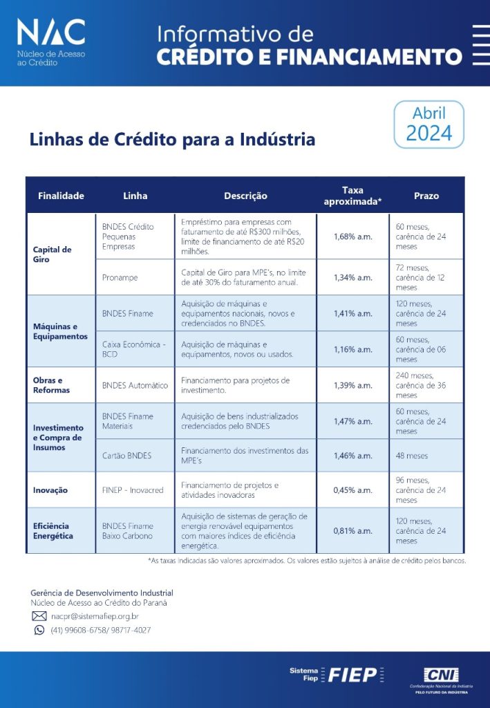 O SINDIMETAL/PR divulga, nessa oportunidade, o informativo desenvolvido pelo Núcleo de Acesso ao Crédito do Sistema FIEP (NAC/PR). O material tem por objetivo apresentar, para as indústrias paranaenses, as condições das principais linhas de crédito vigentes.