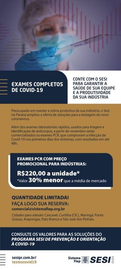 Para empresas associadas aos sindicatos filiados à Fiep (*) o valor de cada teste RT-PCR será de R$ 186,00 (cento e oitenta e seis reais).
